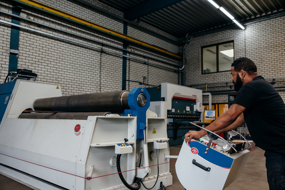 Een afwijking van millimeters op een gebogen plaat wordt centimeters bij montage. Dat vereist een werkplaats die groot formaat walsen beheerst, en controleert vóór verzending.